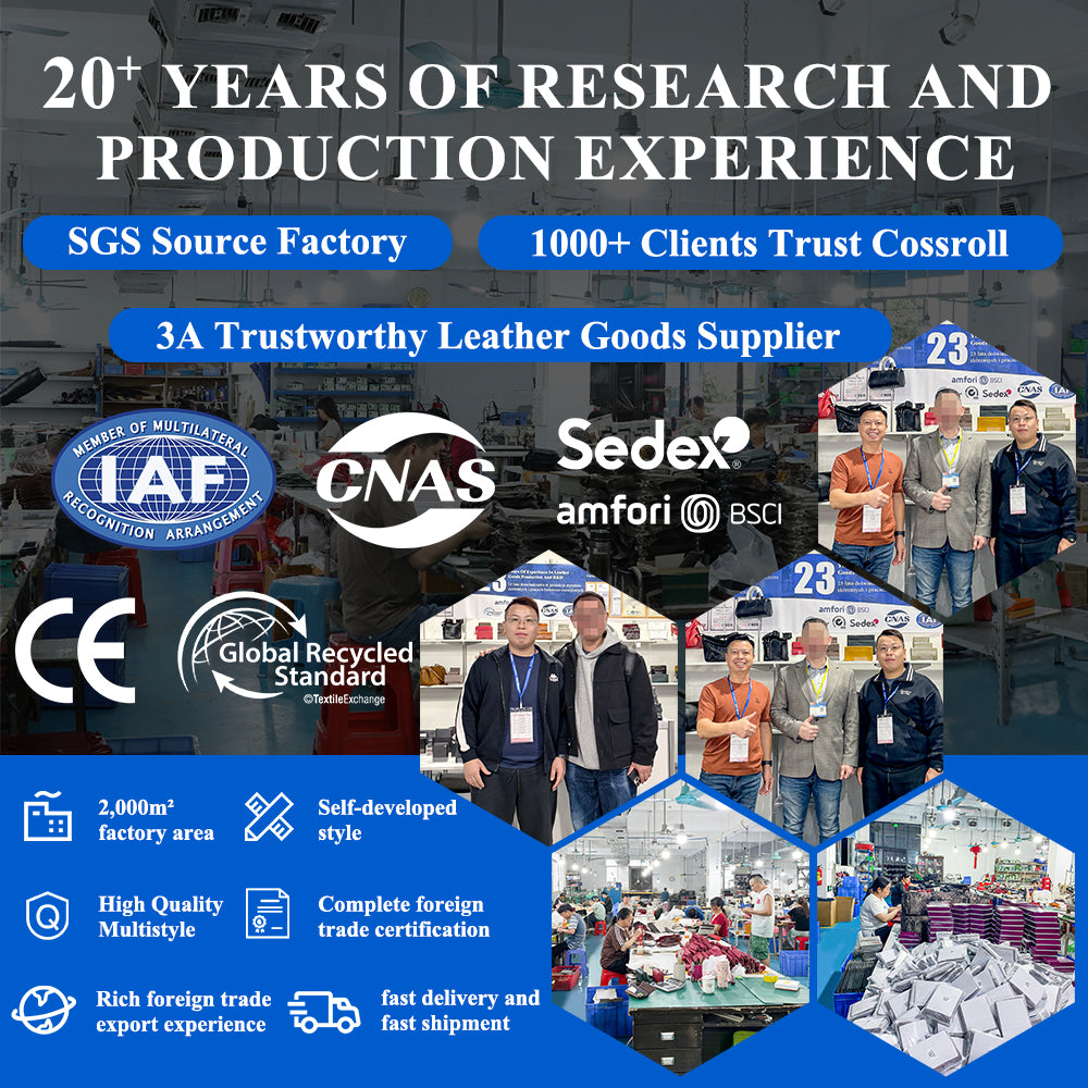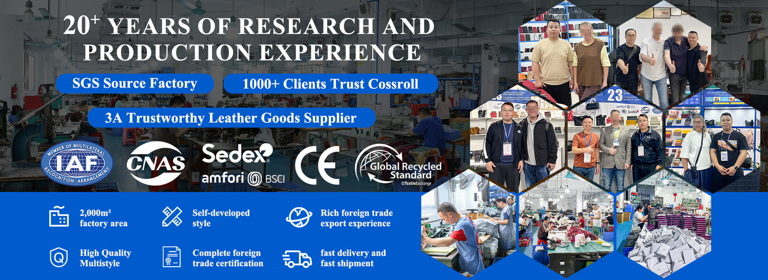 COSSROLL Leather (Guangzhou) Co., Ltd. was established in 2002, is a large leather goods and luggage enterprise integrating R&D, production and sales, mainly engaged in wallets, coin purses, card cases, cell phone bags, handbags and other products.