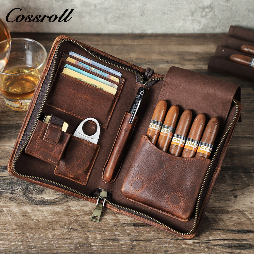 Crazy Horse leather humidor 5 packs with wrist zipper versatile travel convenient leather snow Eggplant tobacco jacket