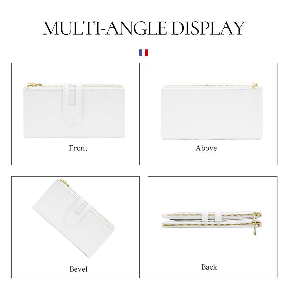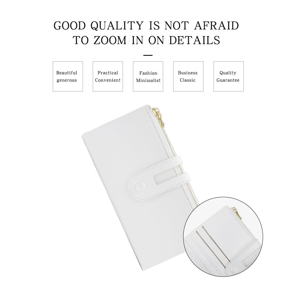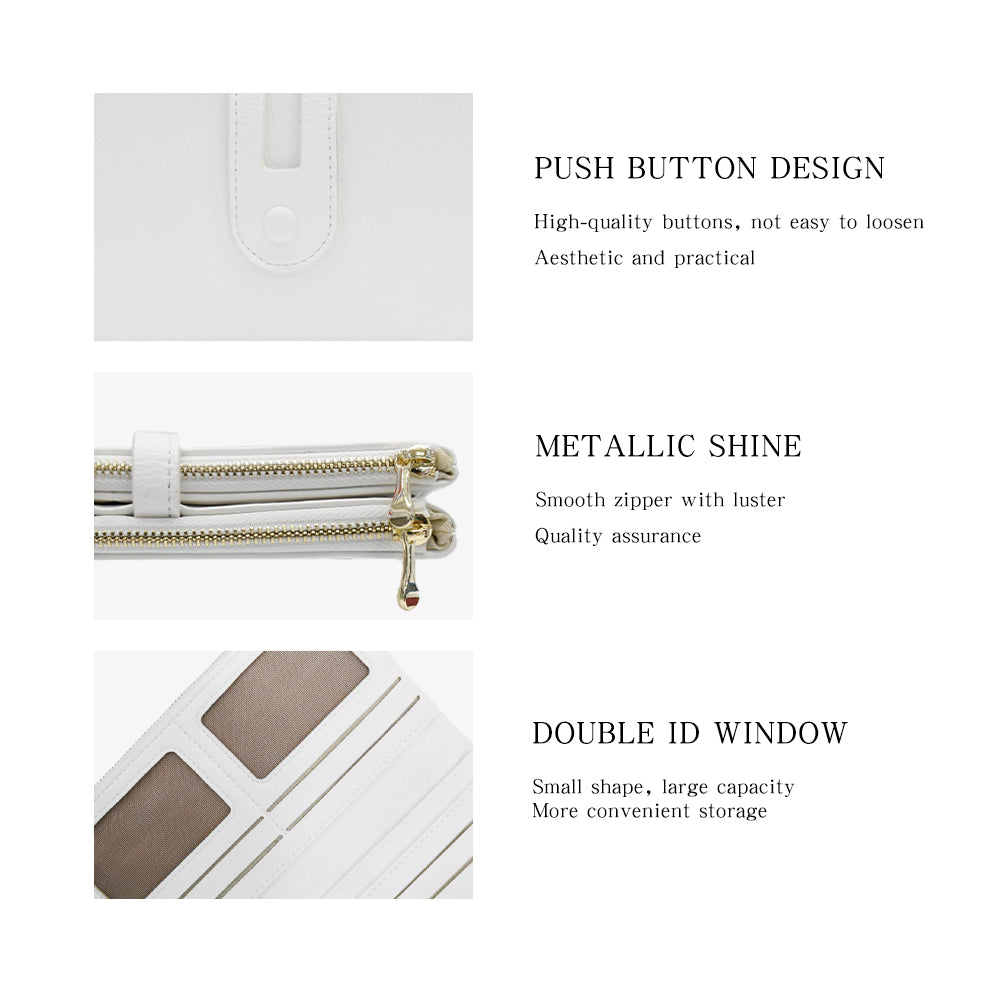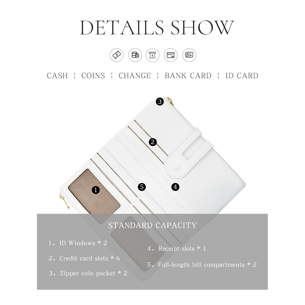 Function Design: Button style, 6 card slots, 1 receipt slot, 2 zipper coin pockets for change, 2 cash compartments, 2 ID windows