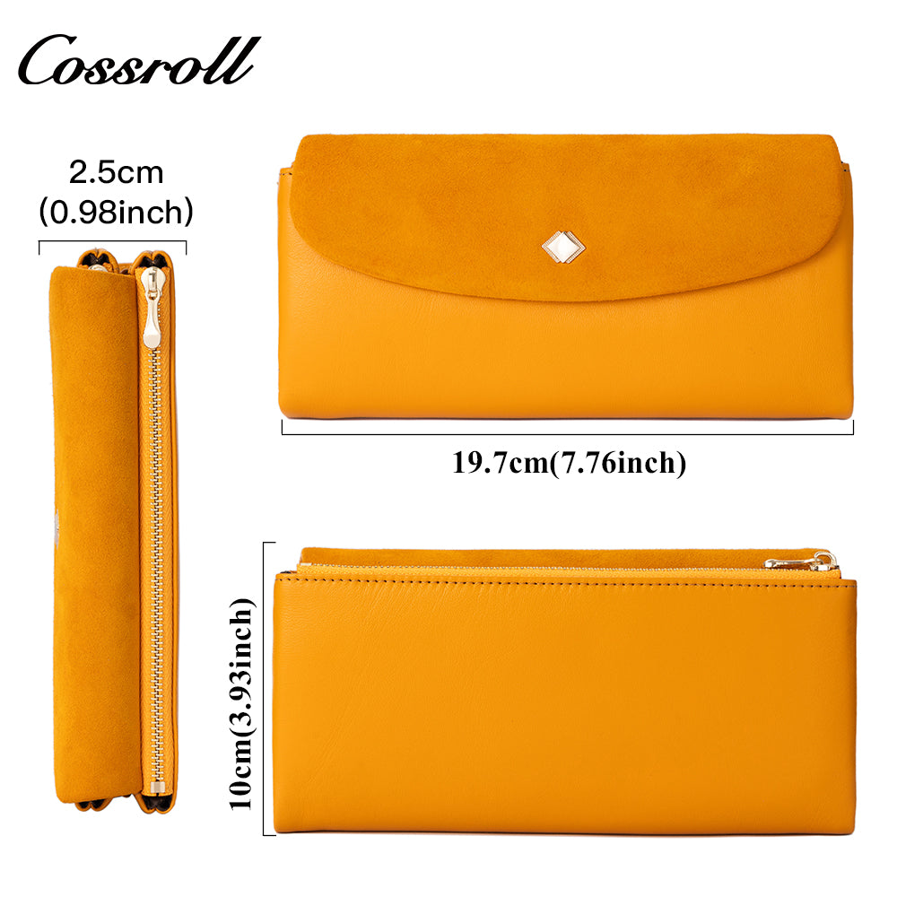 Women's long wallet with multiple card slots, zipper, double-layer bill compartment, and coin purse in suede finish